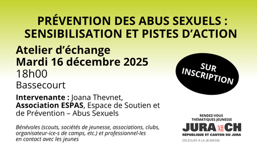 Cet événement vise à sensibiliser les actrices et acteurs de terrain et à identifier des pistes d’action concrètes pour renforcer la protection et le bien-être des enfants et des jeunes dans leurs différents milieux de vie, qu’ils soient associatifs, sportifs, informels, etc. La soirée comprendra une intervention de l’association ESPAS (Espace de Soutien et de Prévention – Abus Sexuels), engagée depuis de nombreuses années auprès des enfants et des adultes concernés par les abus sexuels.